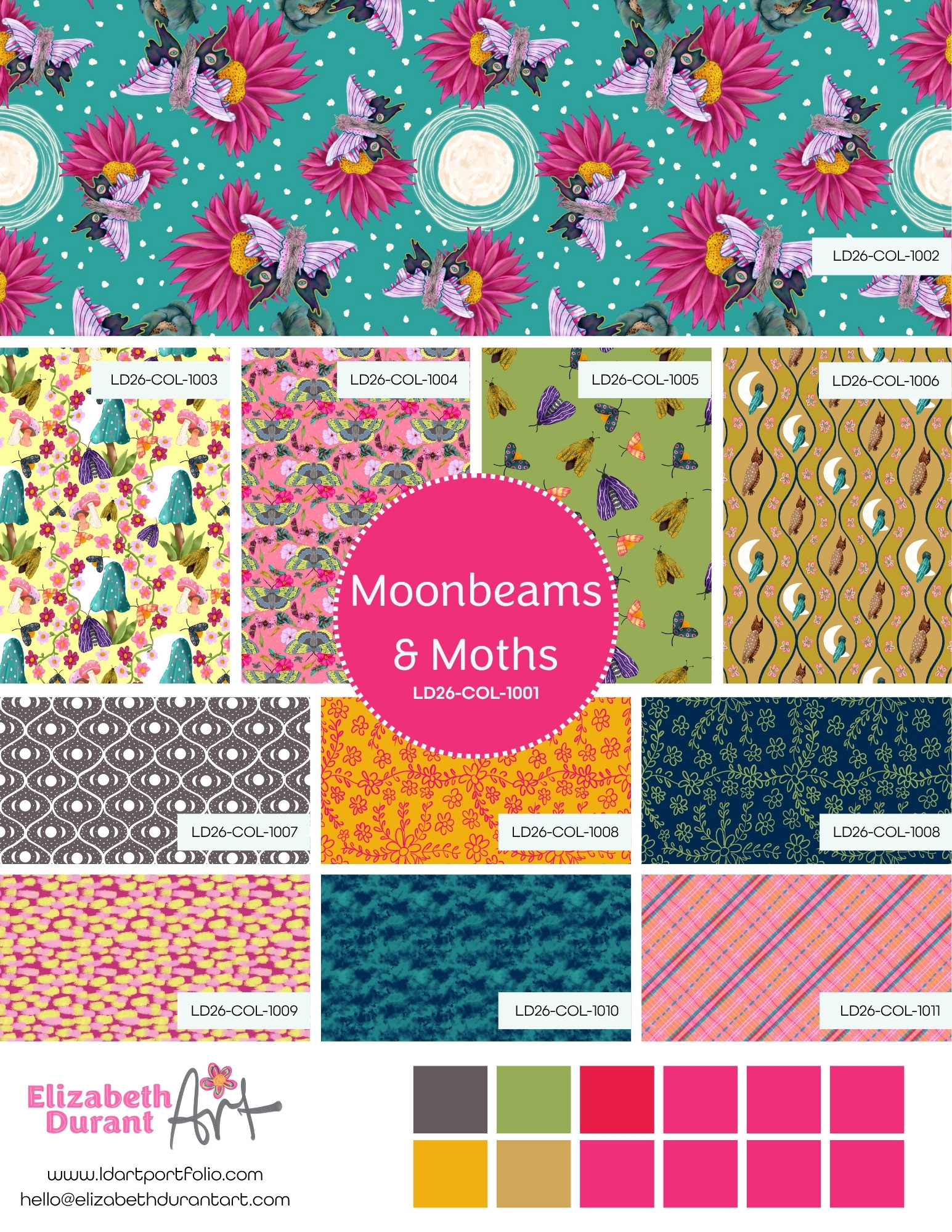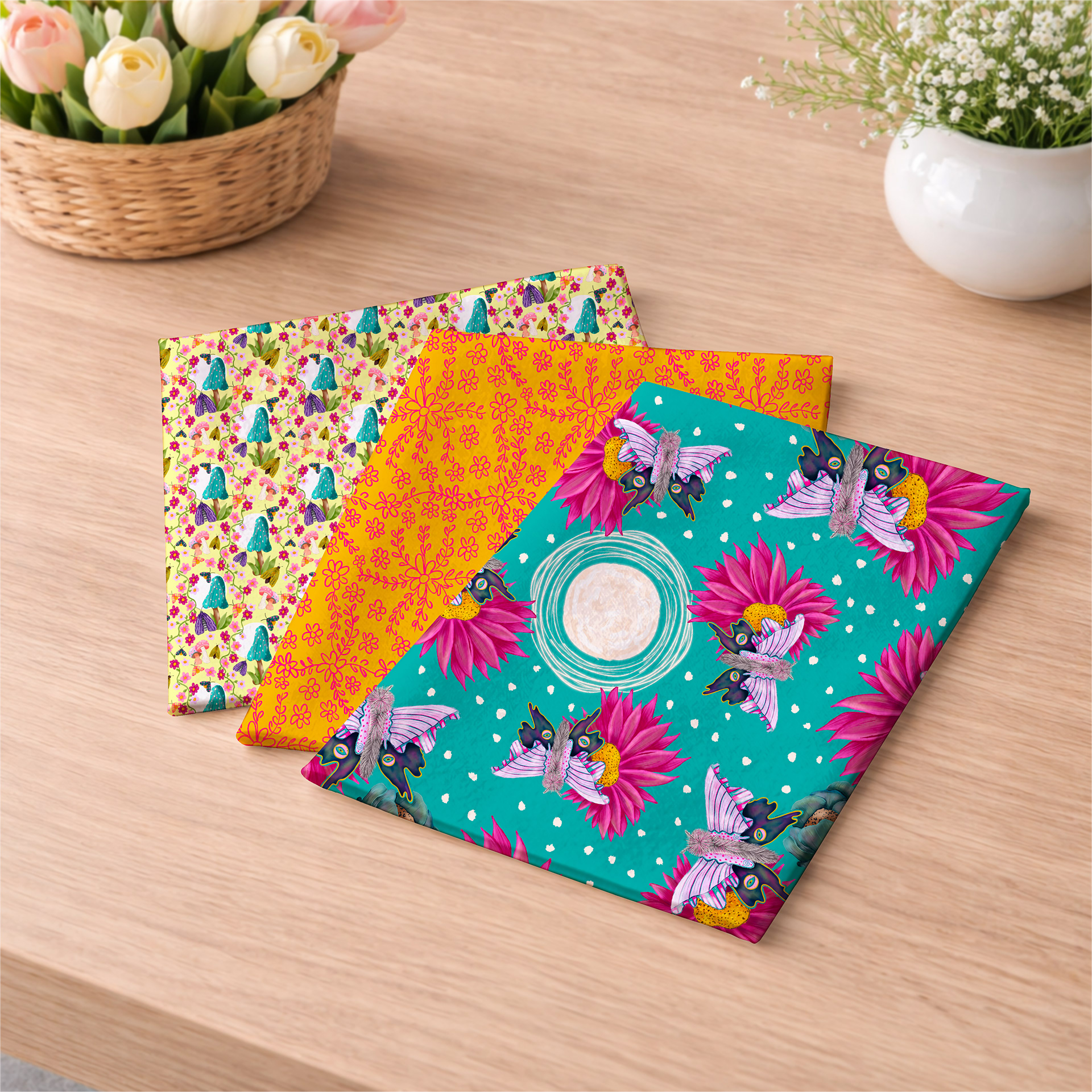 The palette dances between vibrant pinks, mossy greens, golden ochres, and deep twilight blues, creating a balance of energy and calm. It’s a collection made for storytelling. Perfect for products that feel expressive, cozy, and a little bit spellbound.